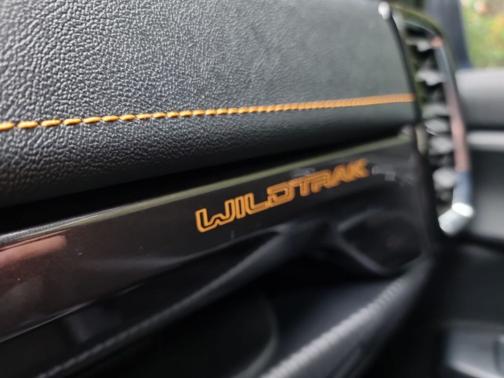 Premium touches run throughout: orange stitching on the steering wheel, seats, and door panels, plus a carbon-finish dash proudly stamped with the Wildtrak name. The steering wheel puts adaptive cruise control on the left spoke and infotainment controls on the right, everything at your thumb’s reach.